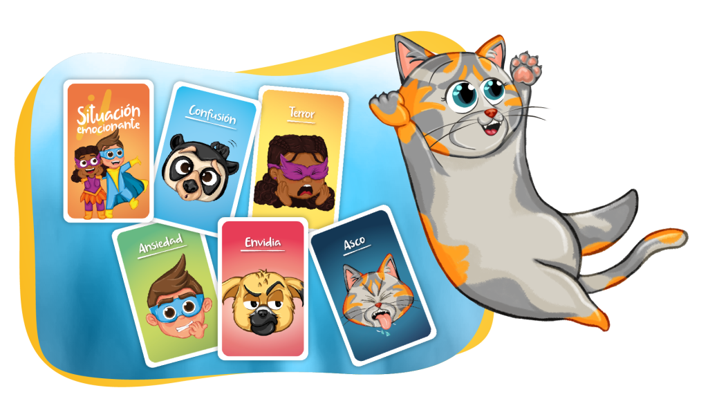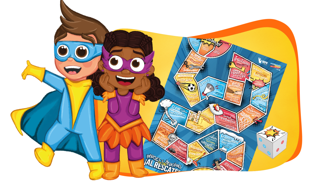 Al rescate: niños y niñas de 6 a 12 años para 2 a 5 jugadores. Todo inicia con la creación del antifaz de su superhéroe o heroína y continua con un divertido recorrido por un tablero lleno de misiones, que les brindarán tips sobre el manejo de sus emociones por medio del canto, el baile, la actividad física, la respiración o un buen grito diciendo: ¡NO!